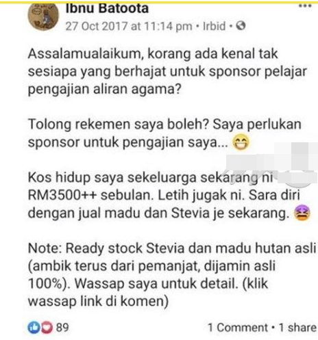 Tuy nhiên, chuỗi ngày “sống lỗi” của người đàn ông này không chỉ gói gọn trong việc bỏ bê con cái. Năm 2017, anh ta từng bị “bóc mẽ” bộ mặt giả tạo vì kêu gọi người tài trợ kinh phí để hoàn thành việc học tại Jordan dưới cái tên Ibnu Batoota. Nguồn thu nhập đến từ việc bán mật ong và cỏ ngọt Stevia chẳng thể giúp cả gia đình xoay sở sinh hoạt phí lên đến 3.500 RM (hơn 19,4 triệu VND) mỗi tháng.