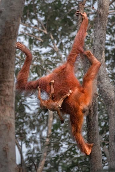 Bức ảnh chụp bà mẹ đười ươi treo mình trên cây để lượm quả ngọt về làm bữa tối, bên hông là đứa con mới 3 tháng bám mẹ một tấc không rời đã khiến cộng đồng mạng thi nhau “rụng tim” vì quá dễ thương. Nhiếp ảnh gia Julia Wimmerlin đã bắt gặp khoảnh khắc ấm áp này khi dạo bước trong Công viên quốc gia Tanjung Puting ở Indonesia. Cô chia sẻ: “Tôi không ngờ mình lại có thể may mắn trông thấy bức tranh gia đình vui vẻ của hai mẹ con đười ươi. 'Em bé' này mới được 2 - 3 tháng tuổi thôi nên bám mẹ cực kỳ. Hành động của cả hai chẳng khác chi con người”.