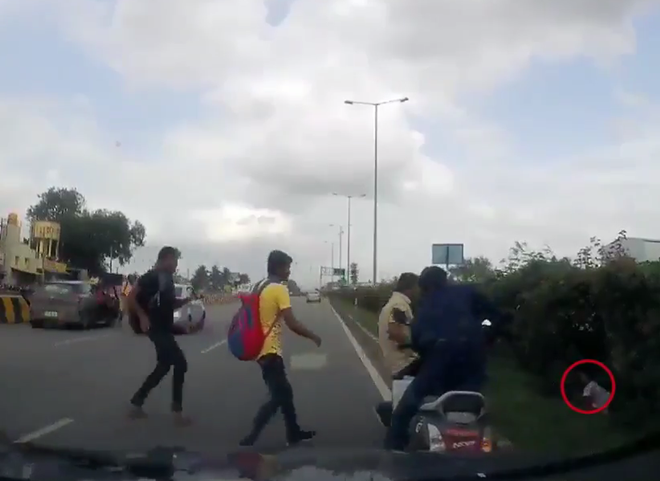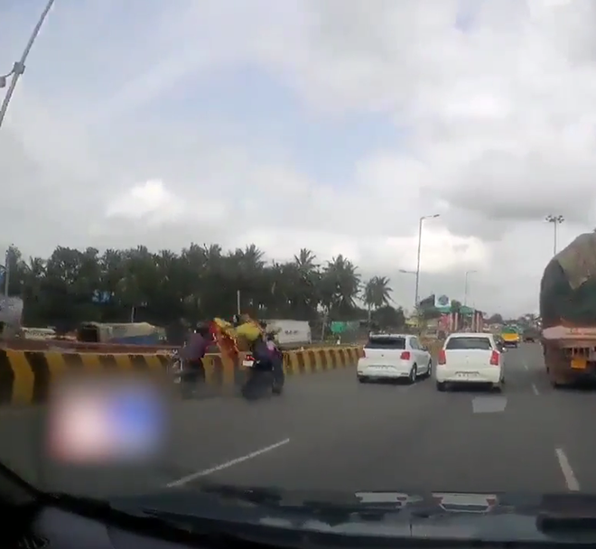 Vụ việc xảy ra vào ngày 19/8 trên một con đường đông người ở Bengaluru, bang Karnataka, Ấn Độ. Hai xe máy cùng chiều va chạm nhau khiến cho một người đàn ông và một cặp nam nữ bị ngã văng ra khỏi xe. Một chiếc xe cũng đổ ra lề đường.