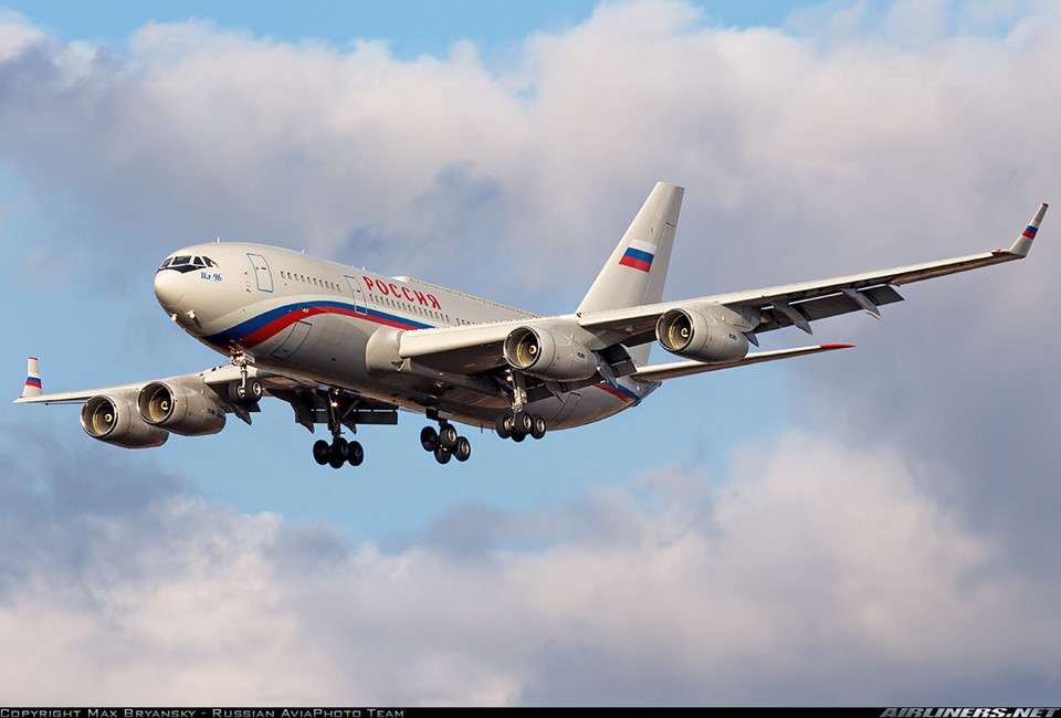 Il-96 của Tổng thống Putin được trang bị 4 động cơ phản lực, tốc độ tối đa 900 km/h, trần bay 12 km. Phạm vi hoạt động lên đến 15.000 km với tối đa nhiên liệu. Ảnh: Airliners.