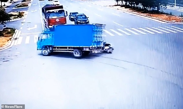 Chưa kịp hoàn hồn sau cú va chạm, người đàn ông tiếp tục bị một chiếc xe tải màu đỏ quệt trúng, do chiếc xe này đột ngột rẽ sang phải để tránh va chạm với chiếc xe tải màu xanh vừa đâm người đàn ông đi xe máy kia.
