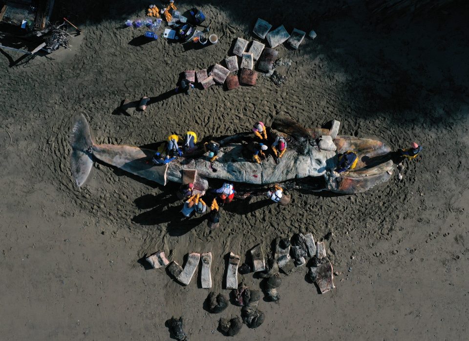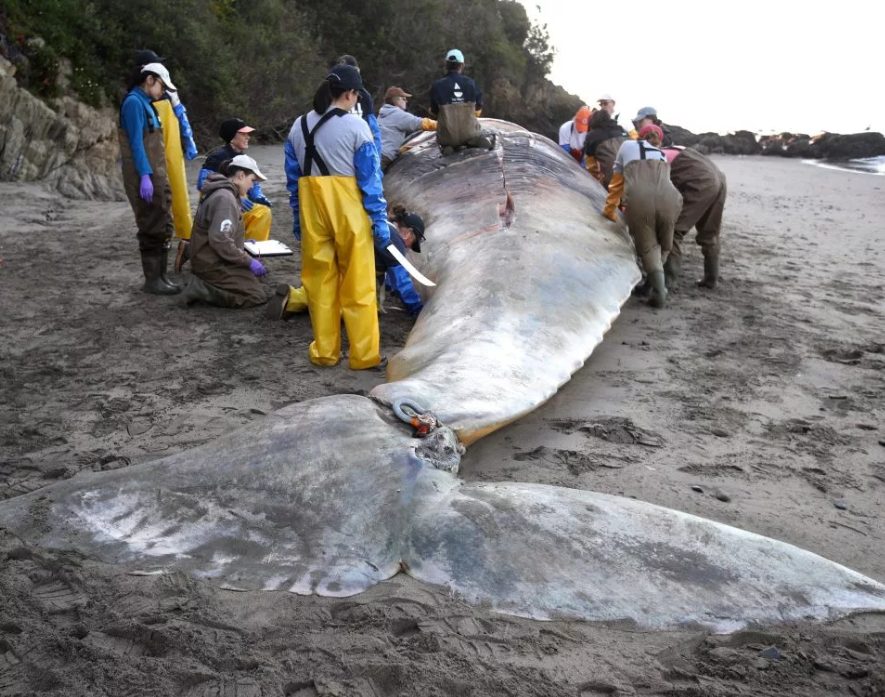 Các nhà khoa học và tình nguyện viên của Trung tâm Động vật có vú ở biển và Viện Hàn lâm Khoa học California đang khám nghiệm tử thi một con cá voi xám trên bãi biển.