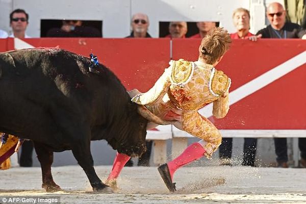 Đấu sĩ bò tót người Pháp Andy bị bò tót tấn công thừa sống thiếu chết.