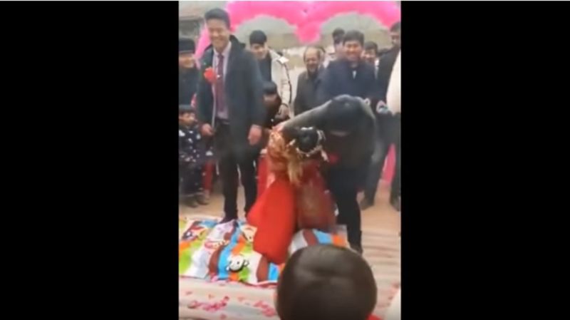 Một đoạn clip khác được chia sẻ trên trang Weibo cho thấy, một cô dâu bị chồng ép phải quỳ gối trong đám cưới. Tuy bị cô dâu từ chối nhưng chú rể vẫn cố gượng ép bằng cách khống chế cả hay ta và chân cô dâu, bắt phải quỳ xuống. Cảnh tượng vô cùng xấu hổ nhưng chú rể vẫn đứng bên cạnh và cười vô cùng khoái chí. Cuối cùng, một người phụ nữ mặc váy trắng đã đứng ra ngăn cản hành động này của chú rể.