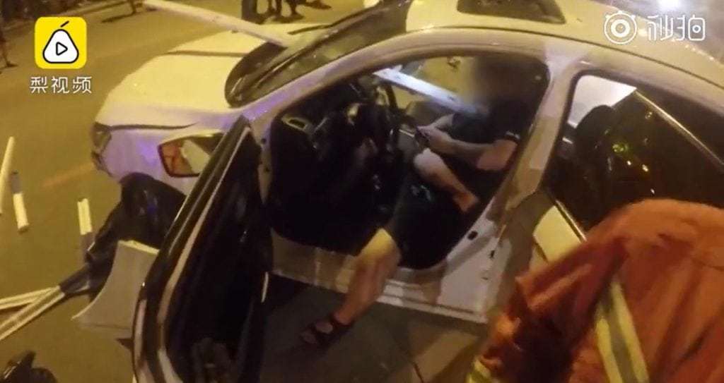 Tài xế vẫn bình tĩnh chơi điện thoại khi bị rào chắn đâm thẳng ngực. Ảnh: Shanghaiist