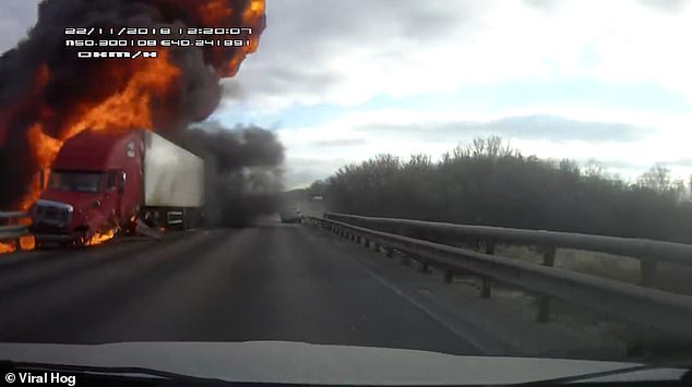 Sau vụ vài giây va chạm, chiếc xe tải bị mất một bánh, đâm vào hàng rào phân cách và bốc cháy dữ dội. Cả chiếc xe tải chìm trong bể lửa nhưng may mắn thay, tài xế đã kịp thoát ra ngoài trước khi xe phát nổ.
