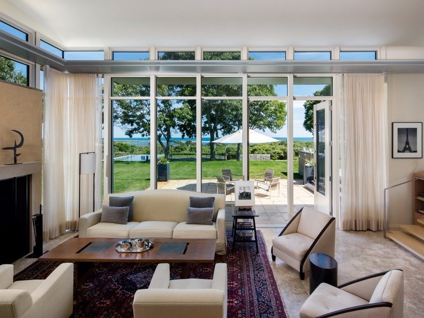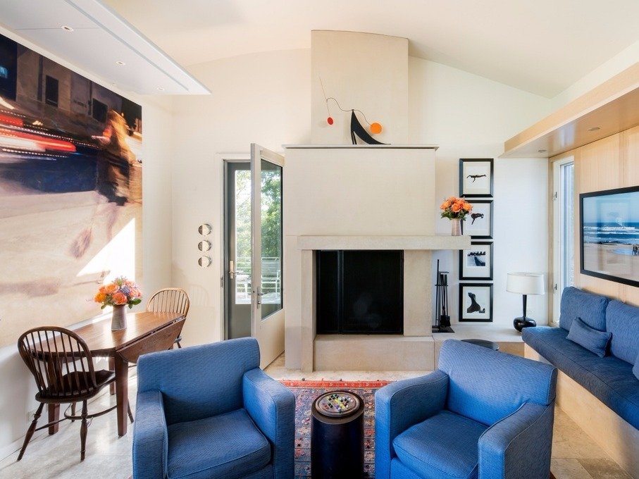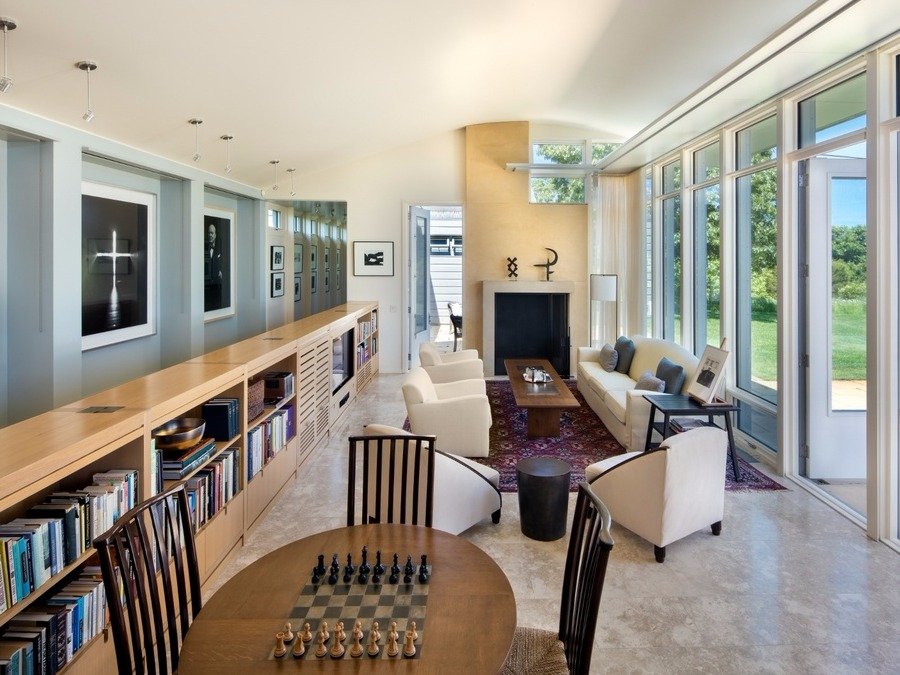 Phòng khách có một lò sưởi, cửa sổ được là bằng kính trong suốt nhìn thẳng ra biển, mang lại cảm giác thoải mái, dễ chịu, hòa hợp với thiên nhiên.