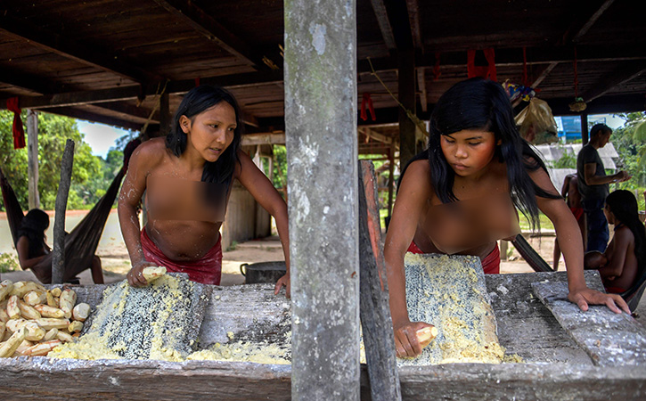 Phụ nữ Waiapi thu hoạch sắn từ một khoảng đất nhỏ ngoài bìa rừng. Để tới nơi, họ phải băng qua sông và đi bộ một quãng đường dài. Sau khi thu hoạch, họ sẽ xắt, mài củ sắn trên các tấm gỗ, sau đó thực hiện quy trình đồ, ủ lên men, chế nước, chưng cất. Ở vùng đất này, rượu thường được cất giữ trong chiếc xuồng gỗ và đổ vào bát được làm từ vỏ bầu.