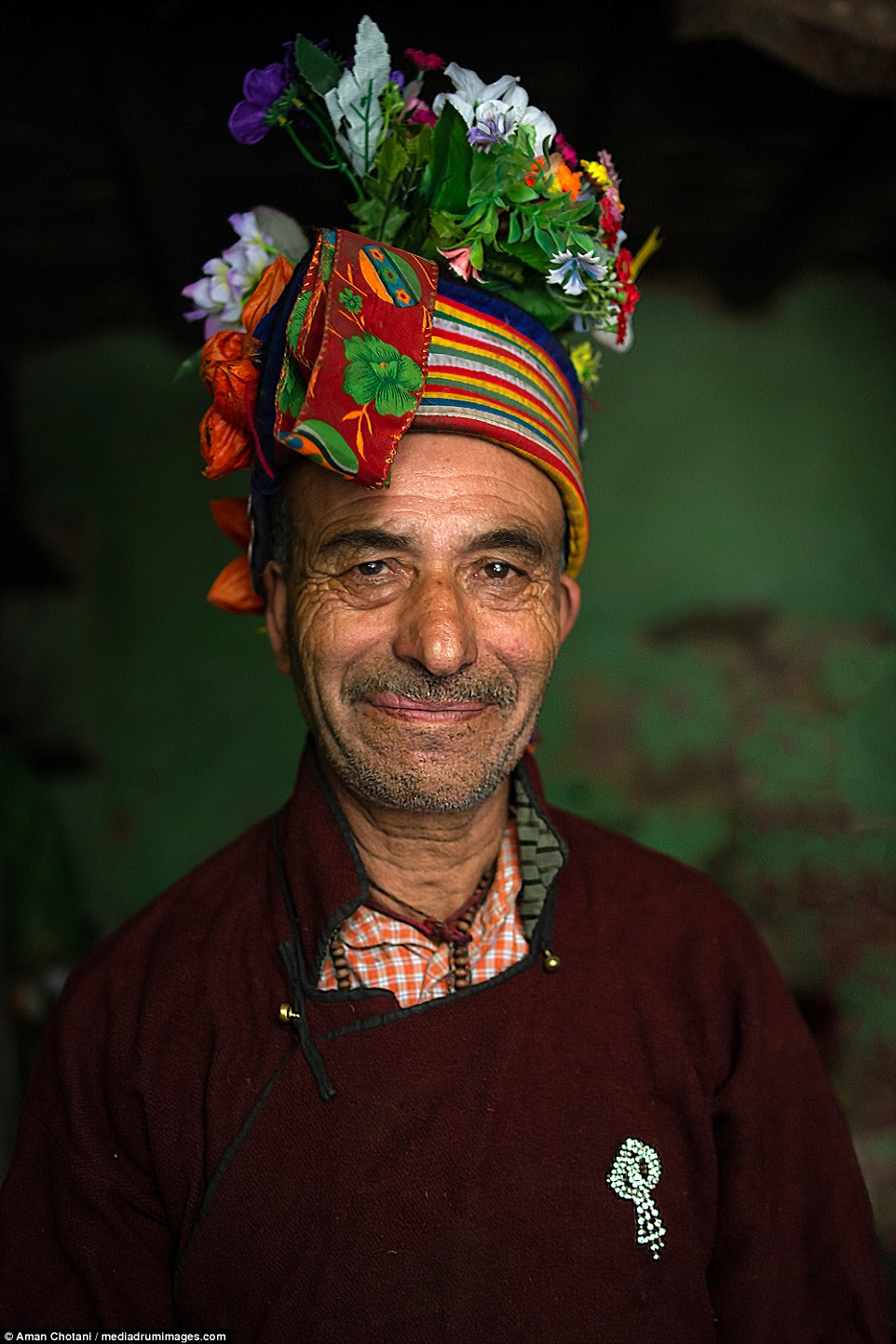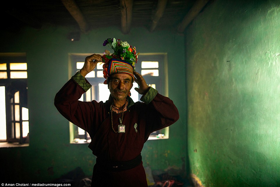 Đàn ông trong bộ lạc Drokpa thường mặc áo len, quần dài, quấn khăn và cài hoa trên đầu.
