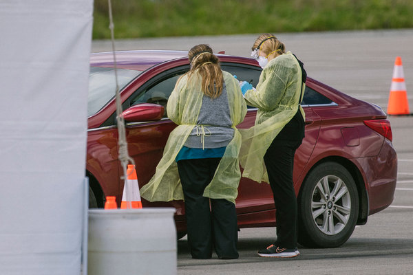 Nhân viên y tế kiểm tra sức khỏe tài xế trên đường. Ảnh: New York Times