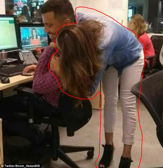 Mọi tranh luận chỉ dừng lại khi tài khoản @boom_likean808 đưa ra lời giải đáp bằng cách khoanh vòng tròn đỏ trên bức ảnh cho thấy cô gái mặc áo sơ mi xanh, quần trắng và đi giày cao gót. Cô ta dựa đầu vào người đàn ông mặc áo kẻ ca rô khi anh ta mỉm cười trước màn hình máy tính. Chính mái tóc của cô gái xõa xuống vai người đàn ông khiến vị trí hai nhân vật trong bức hình như bị đảo lộn.