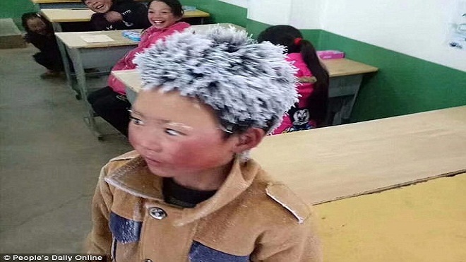 Hiệu trưởng cho biết thêm, kỳ thi cuối kỳ của trường bắt đầu diễn ra từ ngày hôm qua, 8/1, tuy nhiên, nhiệt độ đã bất ngờ giảm sâu xuống âm 9 độ vào buổi sáng nay và có tuyết rơi dày đặc. Hậu quả là đã khiến mái tóc cũng như lông mày của cậu bé bị tuyết và băng giá phủ trắng xóa.