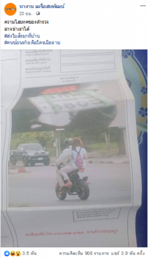 Tình huống dở khóc dở cười này là câu chuyện buồn của một thanh niên Thái Lan khi vô tình để vợ nhận được thư báo phạm lỗi giao thông gửi về nhà. Theo trang Siam Variety, thanh niên này bị triệu tập do lỗi chở người không đội mũ bảo hiểm khi đang lưu thông trên đường. Tuy nhiên, điều bất ngờ hơn là trong bức ảnh ghi lại lỗi vi phạm, người phụ nữ không đội nón ngồi đằng sau lại chẳng phải là vợ anh ta mà là… một cô gái nào đó.