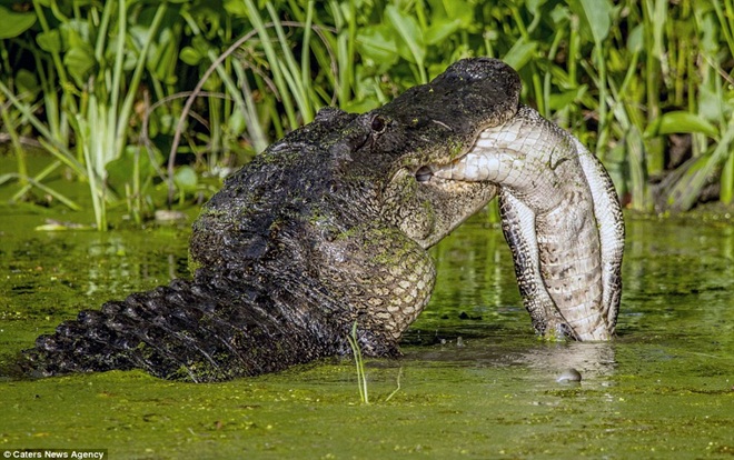 Những hình ảnh tại Công viên bang Brazos Bend ở Needville, bang Texas, Mỹ cho thấy một con cá sấu nước ngọt kẹp chặt lấy con cá sấu non. Dù đã cố hết sức vùng vẫy, nhưng con mồi vẫn không thể thoát thân. Cảnh tượng diễn ra rất nhanh thể hiện sức mạnh tàn bạo của con cá sấu to lớn.
