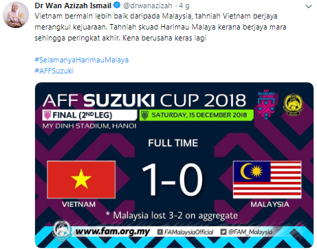 Trên trang Twitter cá nhân, phó thủ tướng Malaysia bà Wan Azizah Wan Ismail cũng gửi lời chúc mừng tới đội tuyển Việt Nam sau chiến thắng ở trận chung kết. Phó thủ tướng viết: “Đội tuyển Việt Nam chơi tốt hơn Malaysia, xin chúc mừng Việt Nam đã giành cup vô địch. Xin chúc mừng những con hổ Mã Lai đã lọt vào trận chung kết“.