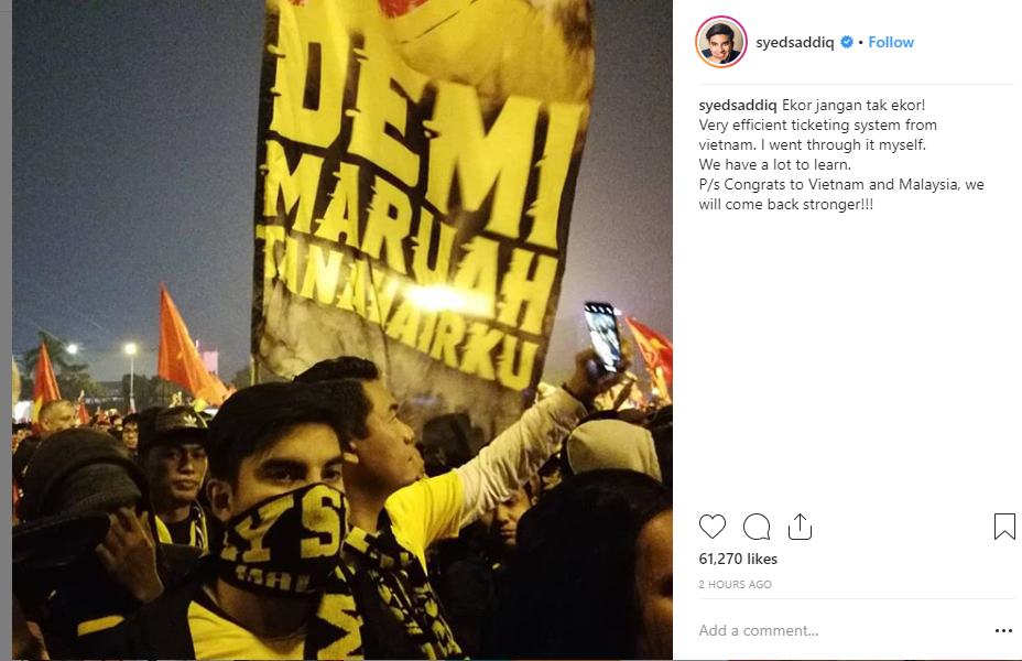 Sau khi trận đấu kết thúc không bao lâu, Syed Saddiq Syed Abdul Rahman, Bộ trưởng 26 tuổi của Bộ Thanh thiếu niên và Thể Thao Malaysia đăng trên trang cá nhân Instagram và Twitter: “Hệ thống bán vé tại Việt Nam rất hiệu quả. Tự tôi đã được vào sân. Chúng ta phải học hỏi họ rất nhiều. Xin chúc mừng Việt Nam và Malaysia ơi, chúng ta sẽ trở lại và mạnh mẽ hơn“.