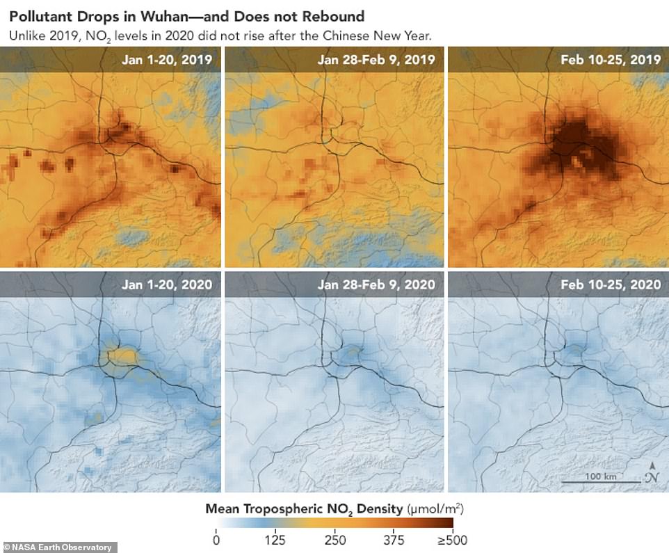 NASA cũng công bố loạt bản đồ phân bố khí nitơ dioxide tại Vũ Hán trong giai đoạn trước, trong và sau kỳ nghỉ Tết Nguyên đán vào năm ngoái và năm nay. Kết quả thu được đã chứng minh nồng độ khí thải đã sụt giảm đáng kể tại Vũ Hán trong vòng 12 tháng qua. Tuy nhiên, theo nhà khoa học thuộc NASA Barry Lefer, kỳ tích đáng mừng này không hoàn toàn là thành quả của đợt cách ly trên diện rộng, mà còn là hồi đáp cho hàng loạt nỗ lực chỉnh đốn luật môi trường của chính phủ Trung Quốc trong những năm qua.