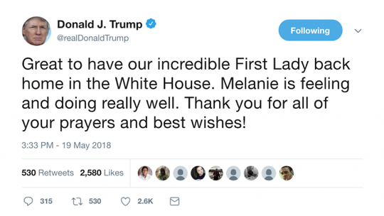 Vào ngày 15/5, ông Trump chia sẻ trên Twitter rằng bà Melania trong tình trạng sức khỏe “rất tốt” và sẽ xuất viện vào “2 hoặc 3 ngày” tới.