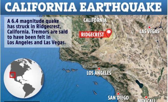 Trận động đất dữ dội này xảy ra tại một vùng hoang vắng gần thành phố Ridgecrest thuộc miền Nam bang California, cách Đông Bắc Los Angeles khoảng 320 km. May mắn đây là một khu vực quân đội phục vụ việc thử bom của Mỹ nằm trên sa mạc Mojave vì vậy cư dân sống nơi này rất thưa thớt.