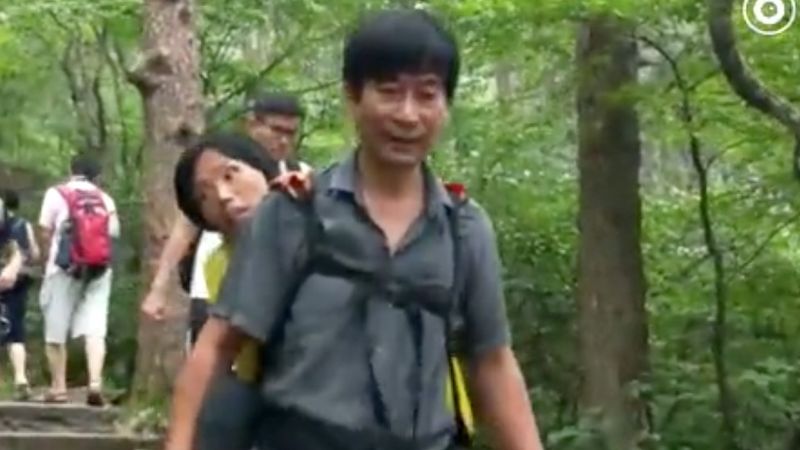 Trong một clip được đăng trên Pear Video hôm 23/7, anh Wang Xiaomin, 57 tuổi, đang địu vợ trên lừng bằng một đai nịt. Anh đi xuống cầu thang từ đỉnh Hoàng Sơn, một trong những ngọn núi nổi tiếng nhất Trung Quốc.