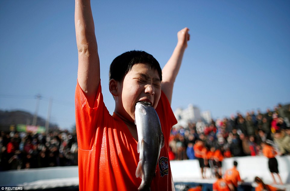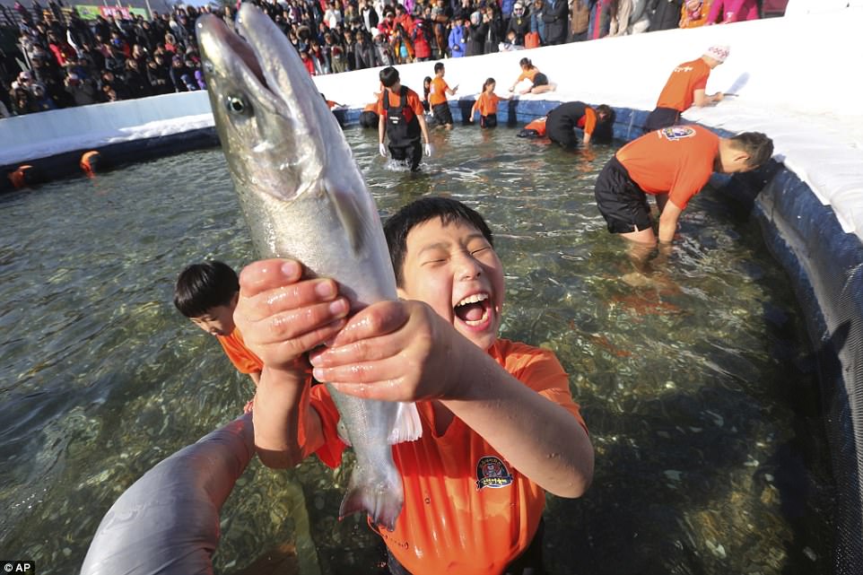Phản ứng thú vị của một cậu bé khi bắt được cá hồi bằng đôi tay trần của mình trong sự kiện quảng bá lễ hội băng ở Hwacheon.