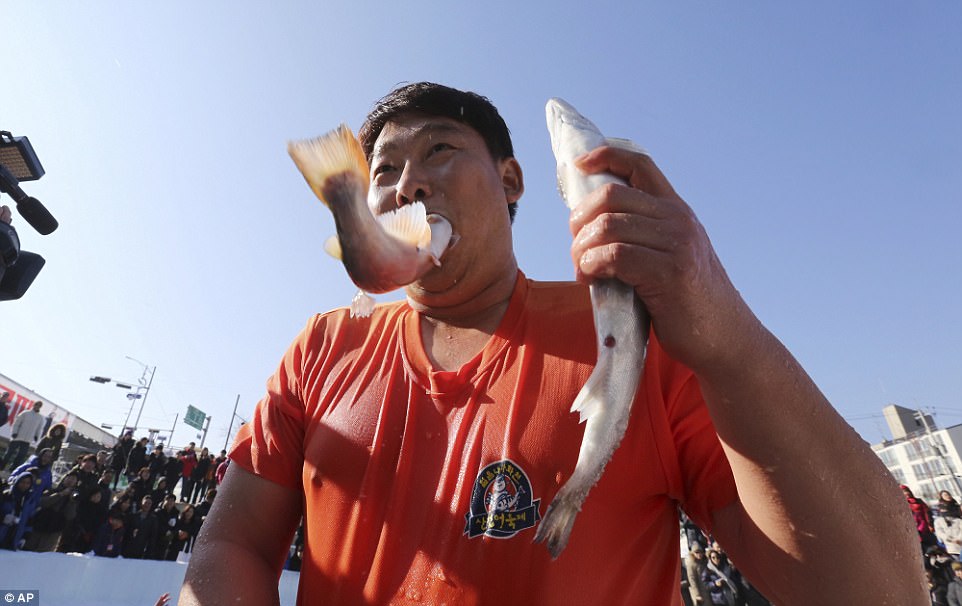 Có khoảng 170 tấn cá hồi được thả xuống sông Hwacheon đóng băng trong mùa lễ hội.