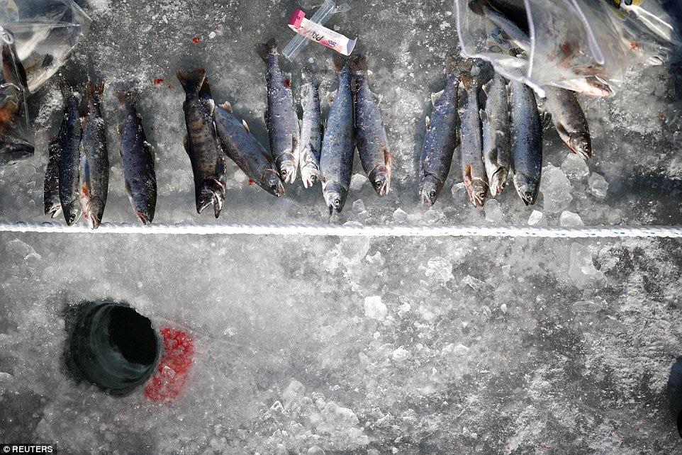 Để câu được cá, người tham gia phải khoan một lỗ trên mặt băng dày đến vài mét.
