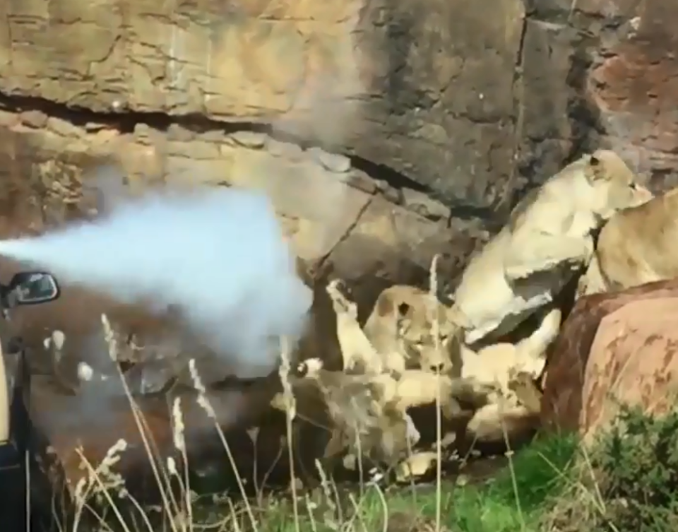 Khi chứng kiến cảnh tượng này, những công nhân của công viên đang ngồi trên một chiếc ô tô trắng gần đó không thể giữ bình tĩnh. Họ sẵn sàng tiếp cận và dùng bình chữa cháy xịt khói vào đám đông. Rất may những con sư tử hung hãn kia bỏ chạy, để lại con mồi trong tình trạng mệt mỏi và chảy khá nhiều máu.