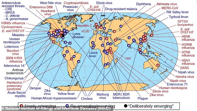 Các chuyên gia còn đính kèm một bản đồ và danh sách các bệnh truyền nhiễm có thể lan rộng toàn thế giới, được chia thành 3 loại: “mới nổi”, “tái phát” và “hồi sinh”. Trong số những dịch bệnh cũ có virus Ebola, Zika, Nipah và 5 loại cúm. Các bệnh sau này có virus tây sông Nile, kháng kháng sinh, sởi, viêm tủy sống liệt mềm cấp tính, sốt vàng da, dịch hạch và thủy đậu.