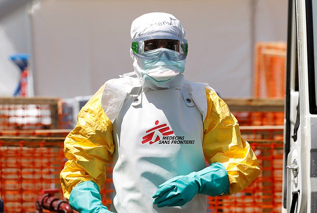Một nhân viên đang khử trùng xe cứu thương chở bệnh nhân nghi mắc bệnh Ebola ở Congo.