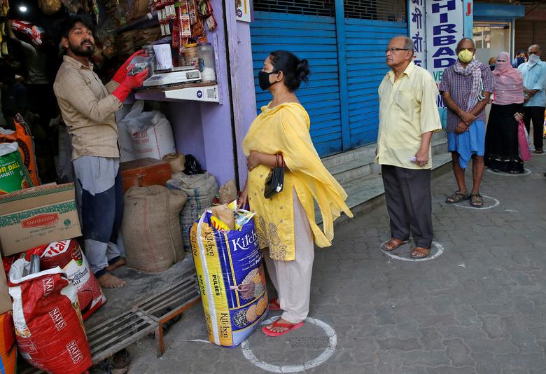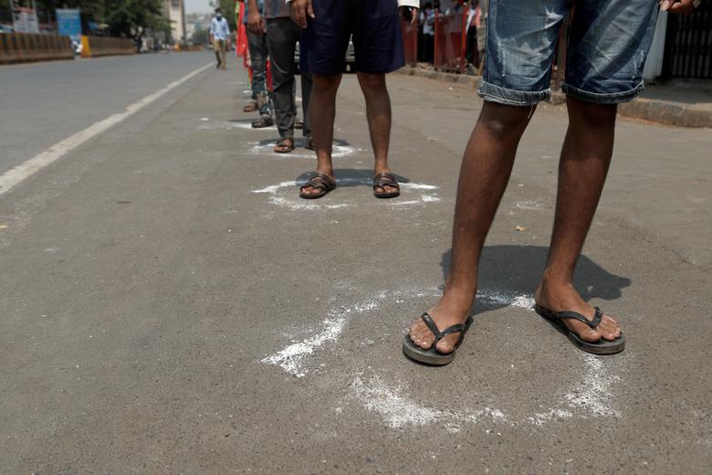 Mọi người xếp hàng theo đúng vòng tròn được vẽ bằng phấn để duy trì khoảng cách an toàn trong lúc chờ mua thuốc ở Ahmedabad ngày 26/3.