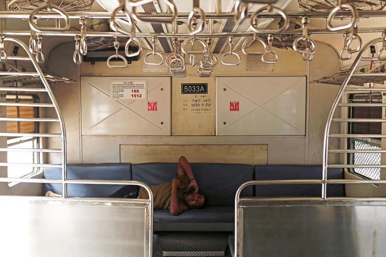 Một nhân viên đường sắt nói chuyện qua điện thoại bên trong khoang tàu trống người sau khi hoạt động đường sắt tạm dừng ở Mumbai. Tính tới 9h ngày 27/3, Ấn Độ ghi nhận 727 người nhiễm và 20 ca tử vong vì COVID-19.