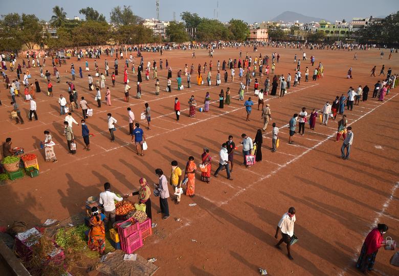 Mọi người duy trì một khoảng cách an toàn khi họ xếp hàng chờ mua rau tại một sân vận động biến thành một khu chợ tạm ở Vijayawada, bang Andhra Pradesh, miền nam Ấn Độ hôm 26/3.