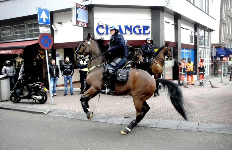 Một cảnh sát kỵ binh đang chuẩn bị cho nhiệm vụ kiểm soát đám đông ở Damstraat, thành phố Amsterdam, Hà Lan năm 2009.