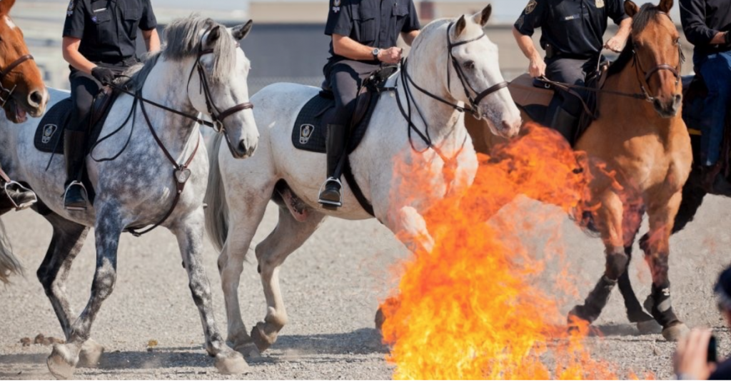 Ngựa trong đội kỵ binh sẽ xuất hiện ở những nơi đông người, có khói thuốc, pháo sáng, súng cùng nhiều tình huống xáo trộn khác. Ngựa cũng phải tập đi bộ trên cầu, bập bênh hay các bề mặt xa lạ khác.