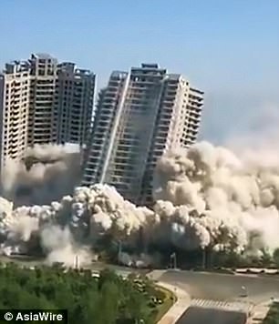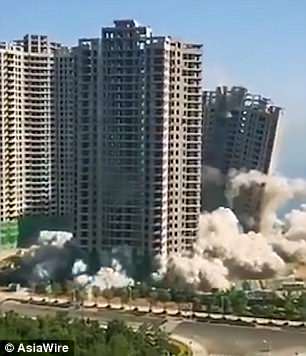 Video ghi lại cảnh tượng sụp đổ trong nháy mắt của 4 “tòa tháp ma” được người dân địa phương ghi lại. Sự việc diễn ra vào cuối tuần qua khi khối nhà cao chọc trời bị phá hủy bằng thuốc nổ có kiểm soát.