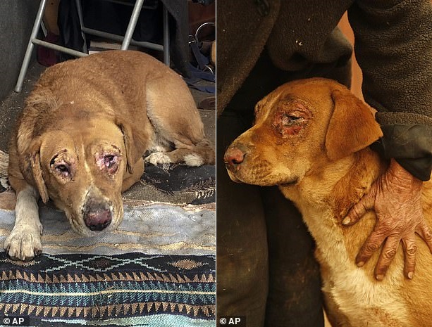 Chú chó đáng thương không thể mở mắt như thường do vết bỏng quá nặng. Ảnh: AP