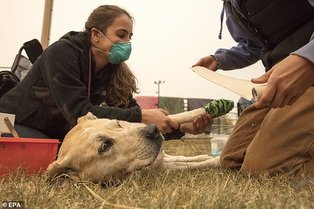 Một chú chó khác được các nhân viên y tế băng bó vết thương ở chân. Ảnh: EPA