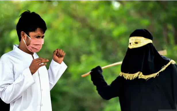 Cặp đôi đeo khẩu trang phòng virus corona và đã kiểm tra thân nhiệt trước khi bị phạt bên ngoài một nhà thờ Hồi giáo.