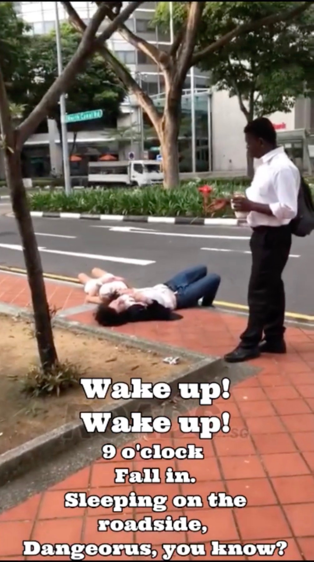 Rạng sáng Chủ Nhật ngày 30 tháng 6 mới đây, một cặp vợ chồng đã được phát hiện đang nằm ngủ trên lề đường North Canal, Singapore. Có vẻ như cặp vợ chồng này đã có một đêm khá vui vẻ vào cuối tuần và cuối cùng trở nên quá say xỉn đến mức chọn luôn lề đường này làm chỗ ngủ. Hình ảnh kì cục về hành động của cặp đôi này đã được đăng tải trên mạng Internet nước này.
