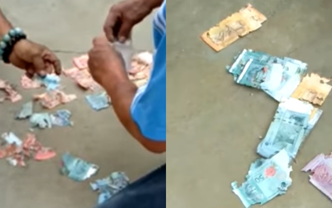 Trong đoạn video, rất nhiều tờ 100 RM (khoảng 550,000 đồng) và 50 RM (khoảng 270,000 đồng) bị thủng lỗ, khiến người xem đau đớn thay cho khổ chủ.