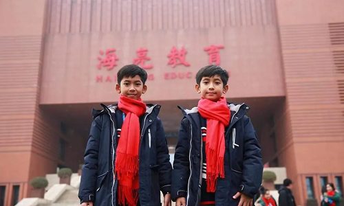 Cậu bé Thuch Salik (trái) tại trường ngoại ngữ Hailang ở Chiết Giang.