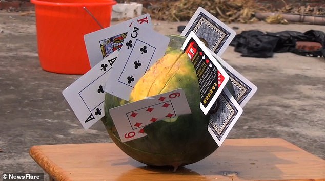 Wang sau đó tiếp tục “phi” những lá bài với tốc độ đáng kinh ngạc, cắt trúng nhiều loại quả khác.