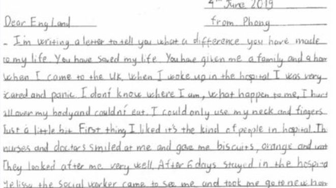 Trong bức thư, Phong viết: “Nước Anh thân mến, cháu viết lá thư này để kể cho mọi người nghe về điều khác biệt mà mọi người đã đem tới cho cuộc đời cháu. Mọi người đã cứu rỗi cuộc sống của cháu. Các cô chú đã cho cháu một gia đình và một mái nhà.