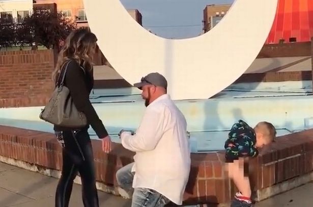 Màn cầu hôn lãng mạn của Kevin Przytula, 33 tuổi, với người bạn đời Allyssa Anter dưới một đài phun nước ở Bay City, bang Michigan, Mỹ đã bị “phá đám” bởi một nhân vật không ngờ tới - con trai của họ. Cậu bé đã vô tư cởi quần đi tiểu ngay lúc màn cầu hôn đang đến thời khắc quyết định.