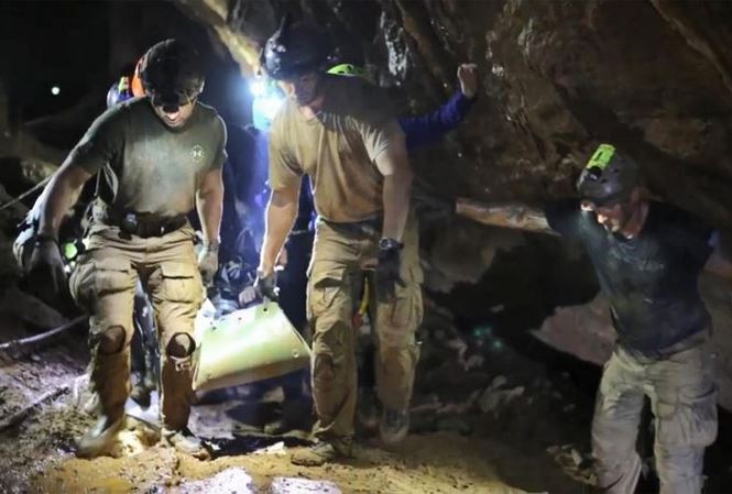 Đội cứu hộ đưa cầu thủ nhí rời hang Tham Luang bằng cáng. Ảnh: AFP