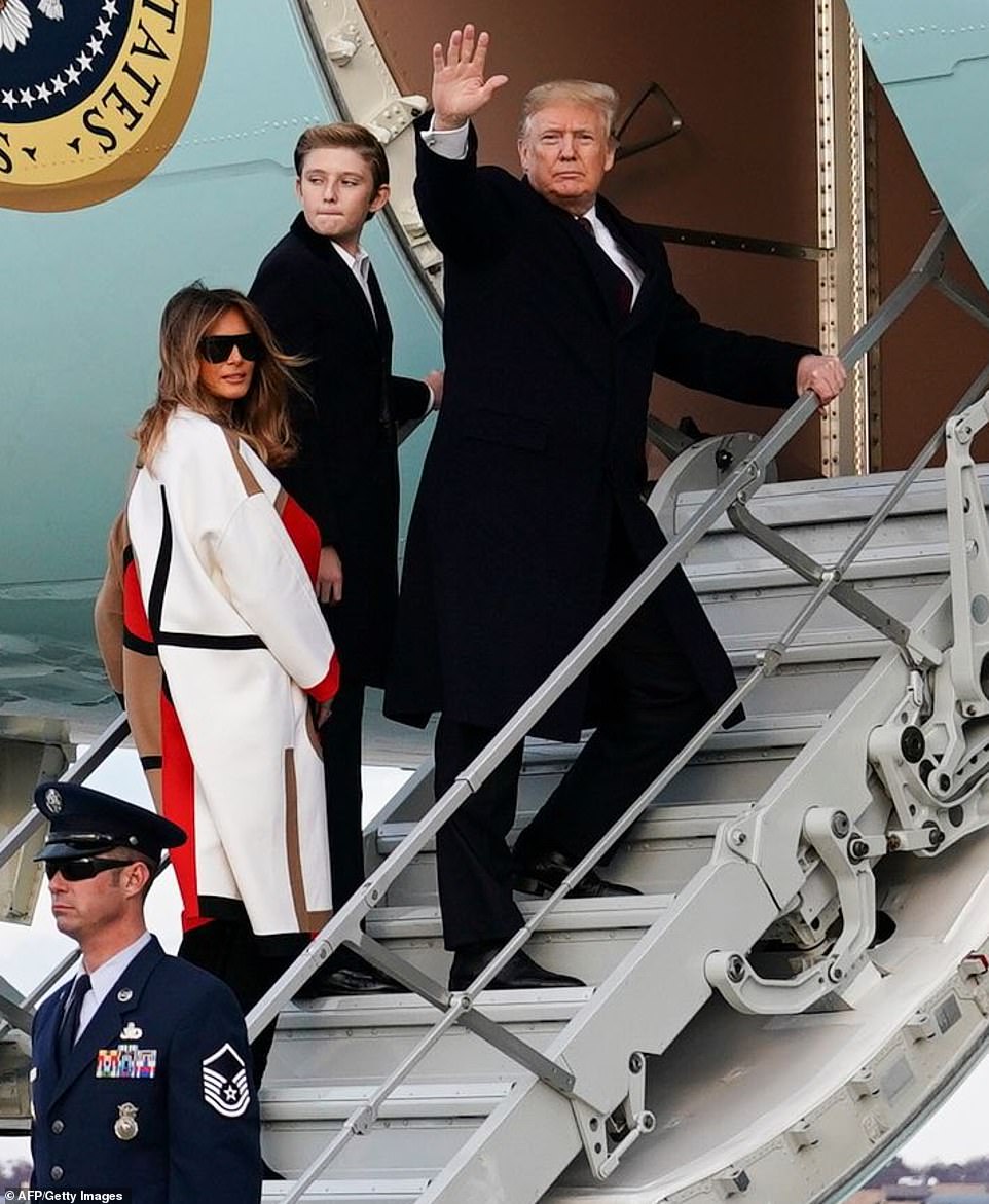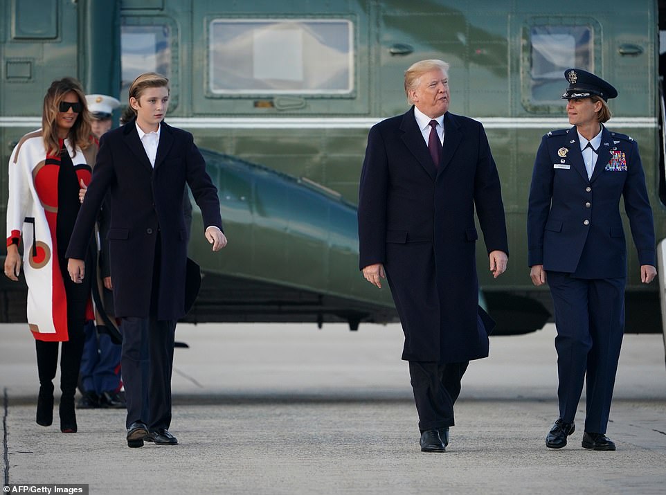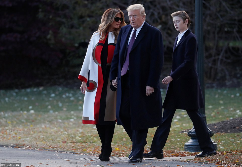 Cậu út nhà Trump đi sau cha mẹ với chiều cao nổi bật. Barron đã không xuất hiện bên cạnh Tổng thống Trump khi ông làm lễ xá tội gà tây hôm 20/11 và cũng không cùng cha mẹ đón cây thông Giáng sinh tại Nhà Trắng một ngày trước đó. Ảnh: Reuters