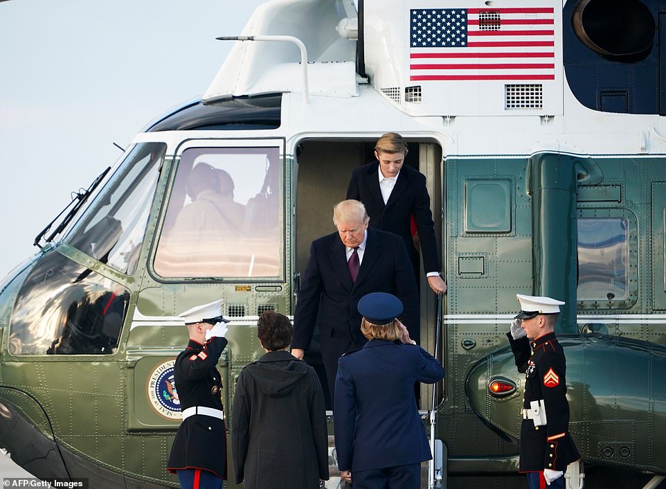 Barron ăn diện khá giống cha, với áo trắng bên trong, vest tối màu dáng dài, chỉ khác là không đeo cà vạt. Không giống như các anh chị em của mình, Barron ít khi xuất hiện trước công chúng. Ảnh: AFP/Getty