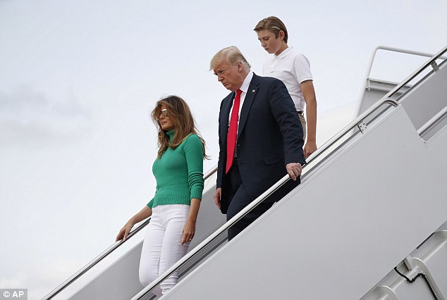 Barron, 12 tuổi, nay đã cao hơn cả mẹ. Bà Melania cao 1m8 trong khi ông Trump cao 1m9. Cậu út nhà Trump mặc áo sơ mi trắng, quần kaki và đi giày thể thao. Ảnh: AP