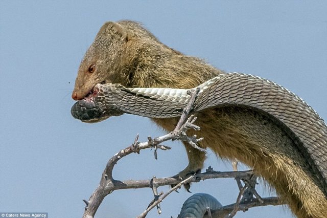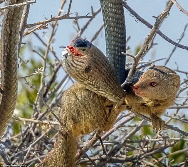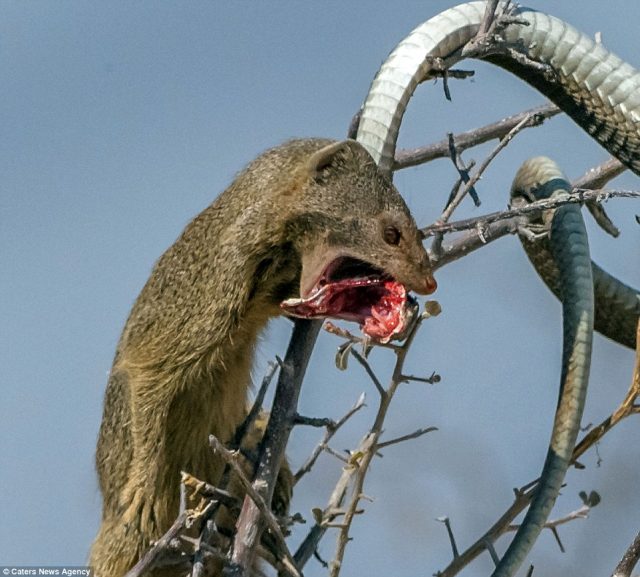 Số phận bi thảm xảy ra với một con rắn boomslang ở công viên quốc gia Etosha, Namibia. Theo đó, khi con rắn này đang nằm nghỉ ngơi trên cây thì đột nhiên bị một con cầy mangut tấn công.
